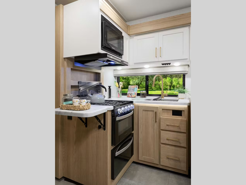 Sleeps 5 Length 24 ft 1 in Ext Width 8 ft 3 in Ext Height 11 ft Int Height 7 ft Interior Color Silk Haze, Snow Leopard Exterior Color Standard Graphics Hitch Weight 8000 lbs GVWR 12500 lbs Fresh Water Capacity 40 gals Grey Water Capacity 35 gals Black Water Capacity 24 gals Furnace BTU 19000 btu Generator 4.0 kW Gas Fuel Type Gas Engine 7.3L V8 Chassis Ford E-Series Horsepower 325 hp Fuel Capacity 55 gals Wheelbase 158 in Number Of Bunks 1 Available Beds Full Torque 450 ft-lb Refrigerator Type 12V Convection Cooking Yes Cooktop Burners 2 Shower Size 24" x 36" Number of Awnings 1 LP Tank Capacity 40.9 lbs Water Heater Type Tankless AC BTU 13500 btu Basement Storage 51 cu. ft. TV Info Cab 32" Smart TV Awning Info 15' Power w/Integrated LED Lighting Gross Combined Weight 18500 lbs Shower Type Standard Electrical Service 30 amp Similar Floorplans